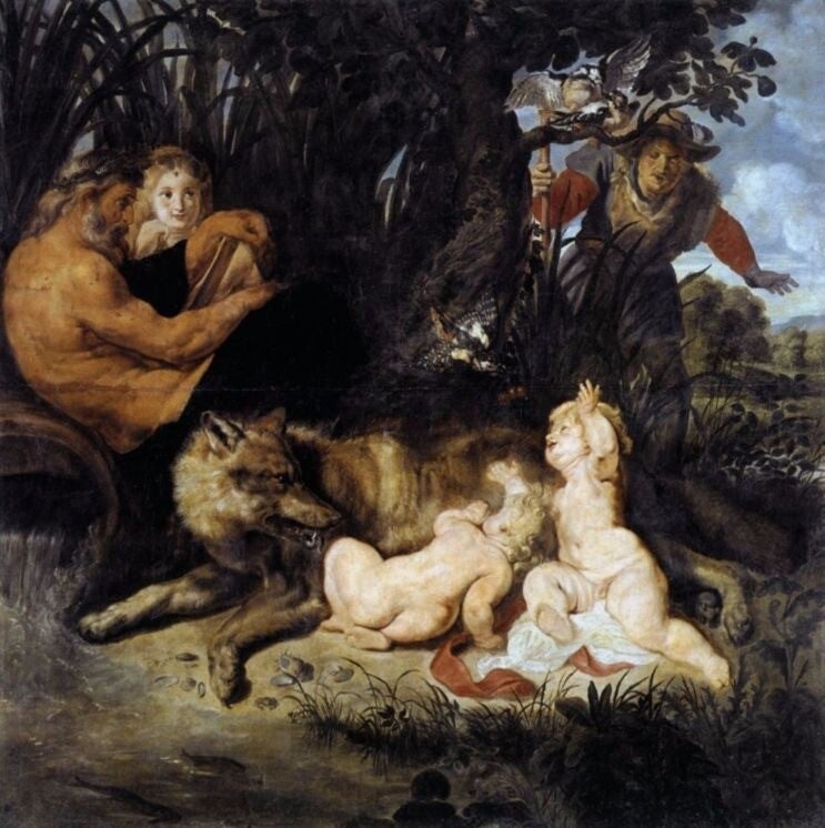 Het verhaal over de stichting van Rome werd voor het eerst opgetekend in de 1e eeuw voor Christus door Vergilius in zijn epos Aeneis. Romulus en Remus zouden de nakomelingen zijn van de Trojaan Aeneas. Aeneas ontsnapte met zijn vader Anchises en zijn zoon Ascanius uit het brandende Troje en belandde na veel omzwervingen aan de rivier de Tiber in Italië.