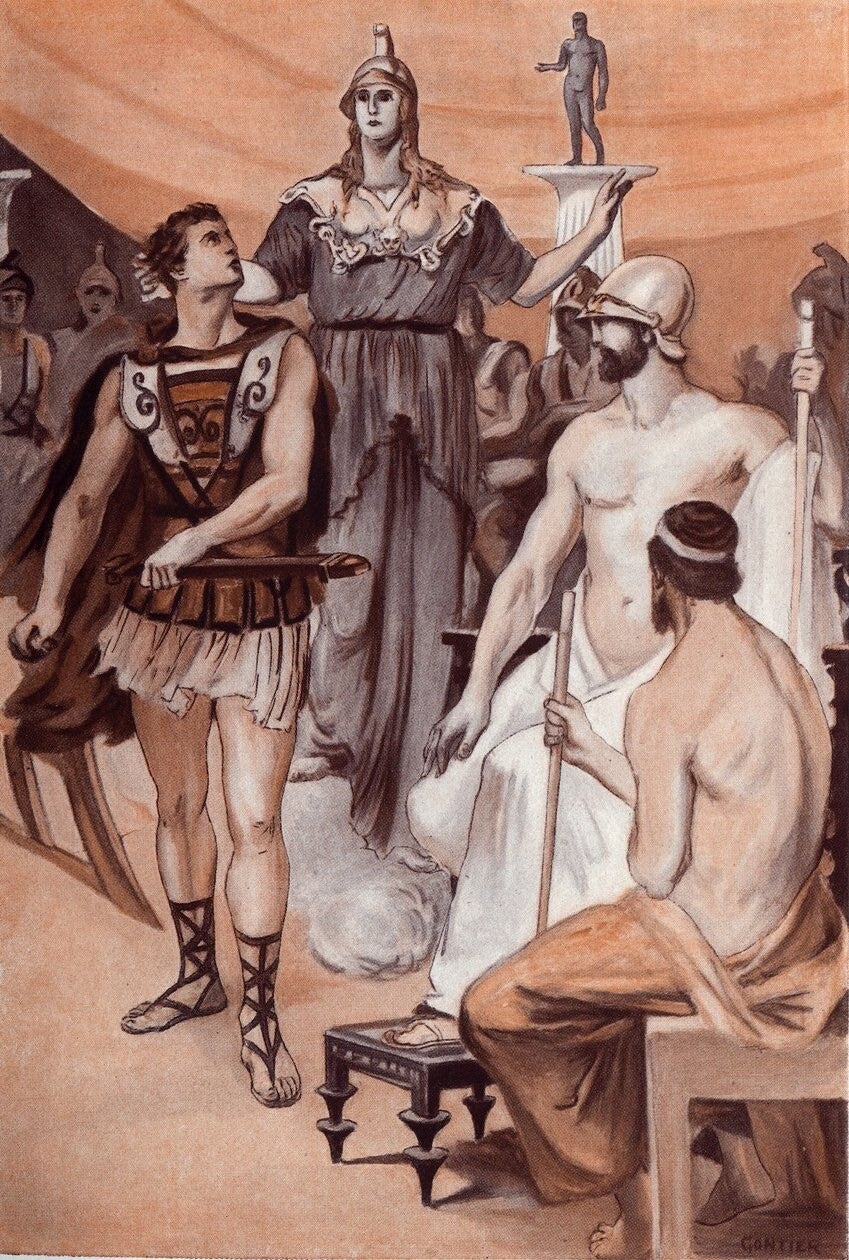 links: De ruzie van Achilles en Agamemnon: Minerva daalde uit de hemel neer en greep Achilles bij zijn haar om te voorkomen dat hij zijn zwaard tegen Agamemnon trok. Illustratie door Clement Gontier (1876-1918) voor Homerus 'De Ilias'